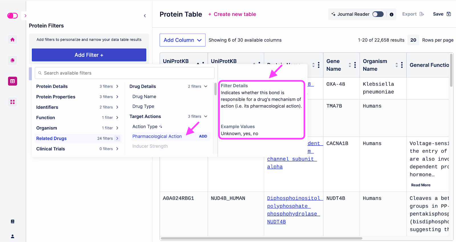 Users can create tables starting from different points, while still being able to connect to other types of data. For instance, one can create a new Drugs table, filter out the ones binding to a specific target of interest and add a column that includes the number of clinical trials in each phase for each drug. The sections below dig deeper into the types of columns and filters that can be applied to each table and their functionality. Here, we provide a general overview of how to navigate those features.